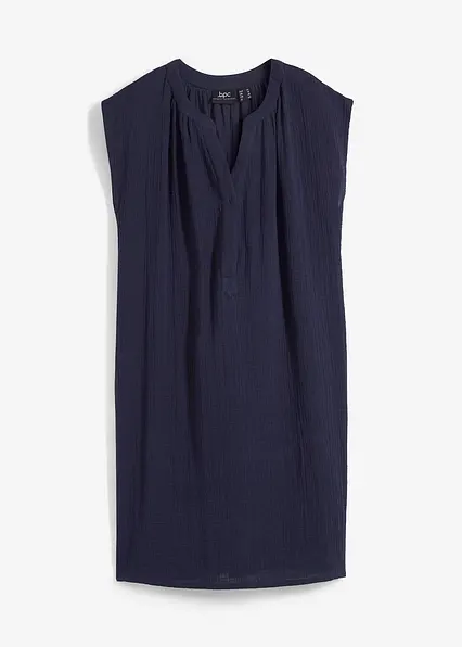 Bequem geschnittenes Schwangerschaftskleid aus reiner Baumwolle, ohne Ärmel und mit überschnittenen Schultern. Der V-Ausschnitt mit einer langen, verdeckten Knopfleiste ermöglicht ein komfortables Stillen.