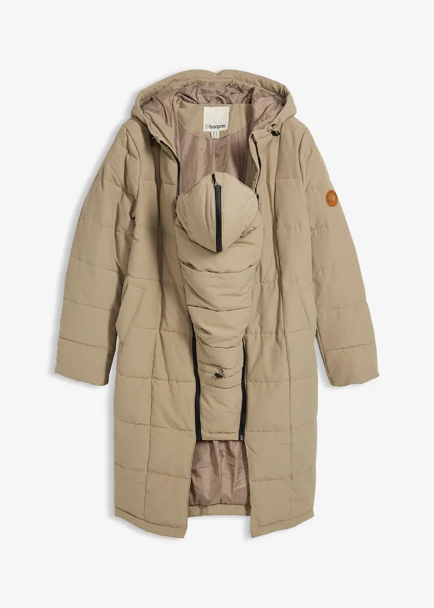 Mittelwarm wattierter Umstandsmantel mit Tragefunktion.