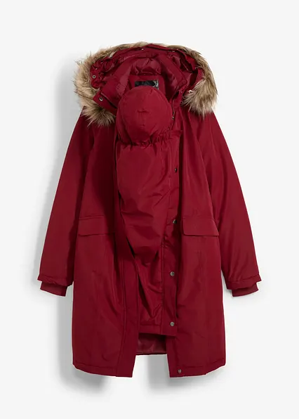 Mittelwarm wattierter Umstandsmantel aus wind- und wasserabweisendem Funktionsstoff. Seitliche Reißverschlüsse bieten zusätzliche Weite und ermöglichen die Jacke nach der Schwangerschaft weiterhin zu tragen. Ein abnehmbarer Trageeinsatz mit Kapuze schützt das Baby vor Wind und Wetter. Mit Stehkragen mit Druckknöpfen, Kapuze mit abnehmbarem Fellkragen. Große, warm gefütterte Taschen und Ärmelabschlüsse aus Baumwollripp.