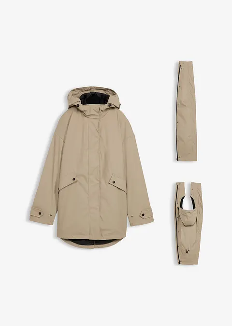 Regen- und windabweisende Funktionsjacke mit zwei Einsätzen: einem Erweiterungseinsatz für die Schwangerschaft und einem Trageeinsatz für das Baby. Die große Kapuze verfügt über einen elastischen Kordelzug und eine Regenblende. In den großen Taschen mit verschließbaren Druckknöpfen lassen sich Alltagsgegenstände sicher verstauen. Die Ärmel sind mit verstellbaren Riegeln und Druckknöpfen versehen, um das Eindringen von Wind und Kälte zu vermeiden. Ohne die Einsätze kann die Jacke als reguläre Jacke getragen werden. Ein Bequemlichkeitsschlitz am Saum sorgt für zusätzliche Bewegungsfreiheit.Die Fleecejacke kann separat getragen werden und lässt sich durch seitliche Reißverschlüsse dem jeweiligen Schwangerschaftsmonat anpassen. Auch die Fleecejacke verfügt über praktische Taschen.