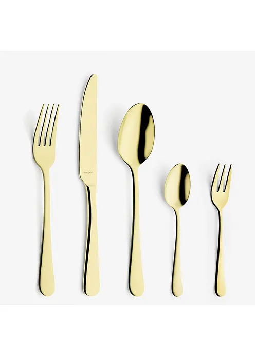 Trendiges Besteckset mit ansprechendem, hochglanzpoliertem Charme. Das Besteckset strahlt, dank seines modernen Designs und der Trendfarben, von besonderer Glamourösität. Die hochwertige PVD Veredelung ist widerstandfähig und langlebig. Bestehend aus 6 Kaffeelöffel, 6 Kuchengabeln, 6 Menügabeln, 6 Menülöffel, 6 Menümesser.