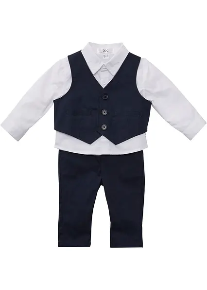 Tolles 3-tlg. Set für Babys. Das Hemd ist aus leichter Baumwolle und hat einen Kentkragen und eine Knopfleiste. Die schicke Weste ist mit 3 Knöpfen vorn zu schließen und hat zwei Ziertaschen. Dazu passt die vorn knöpfbare Hose mit Gürtelschlaufen. So ist dein Baby für jeden feierlichen Anlass perfekt angezogen.