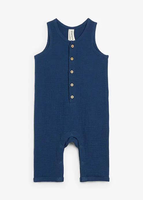 Ärmelloser Einteiler aus weichem Baumwollmusselin. Vorne mit durchgehender Knopfleiste in Holzoptik, offenen Abschlüssen an Armen und Beinen sowie lockerem Schnitt für angenehme Bewegungsfreiheit. Leicht und atmungsaktiv – ideal für warme Sommertage.