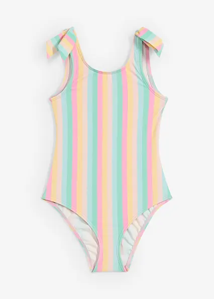 Schöner Badeanzug mit tollen Streifen und Schleifen-Optik, vorne mit einem Futter unterlegt.