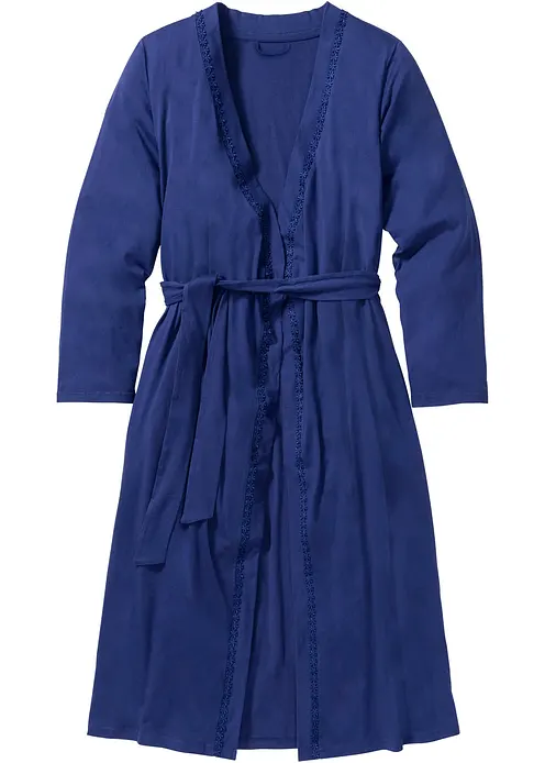 Der bequeme Jersey-Morgenmantel der Marke bpc lässt sich angenehm beim Saunen oder als Loungewear über dem Pyjama tragen. Das softe Material aus Baumwolle fühlt sich wunderbar auf der Haut an. Entlang des Schalkragens bis hinunter zum Saum ist der Bademantel mit einer Zierkante aus Blüten besetzt.Mit dem Bindeband lässt sich das Modell fixieren. Die zwei Eingrifftaschen an den Seiten machen das komfortable Design komplett.