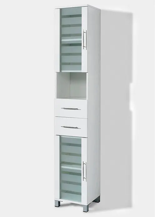Der schmale Hochschrank "Ted" stellt eine praktische und zugleich dekorative Erweiterung der Badezimmereinrichtung dar. Besonders geschmackvoll präsentieren sich die teilweise gefrosteten Fronten, die dem Schrank einen modernen Charme verleihen. Zudem erweist sich der Hochschrank als Platzwunder. Ablagemöglichkeiten bietet er in Form von Holzeinlegeböden hinter den Türen und einem offenen Fach. Der schmale Hochschrank "Ted" ist in verschiedenen Farben erhältlich und fügt sich somit harmonisch in das vorherrschende Einrichtungskonzept.