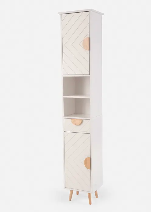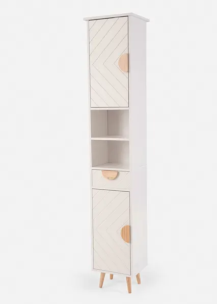 Der elegante Schrank, der modern und gleichzeitig zeitlos wirkt, bietet nicht nur Stauraum, sondern verschönert jedes Badezimmer. Die besonderen Fronten und warmen Holzdetails schaffen eine harmonische Atmosphäre, die zum Verweilen einlädt. Perfekt für Deinen Wellnessbereich Badezimmer.Erschaffe Deinen ganz eigenen Rückzugsort mit diesem Hochschrank und den anderen Möbeln dieser Serie.