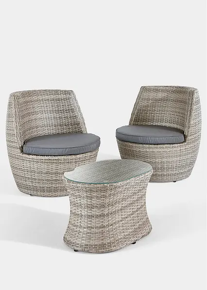 Material:Bezug: 100% Polyester, Gestell: 100% Stahl, Polster: 100% Polyurethan, Geflecht: 100% Polyethylen, Tischplatte: 100% Sicherheitsglas