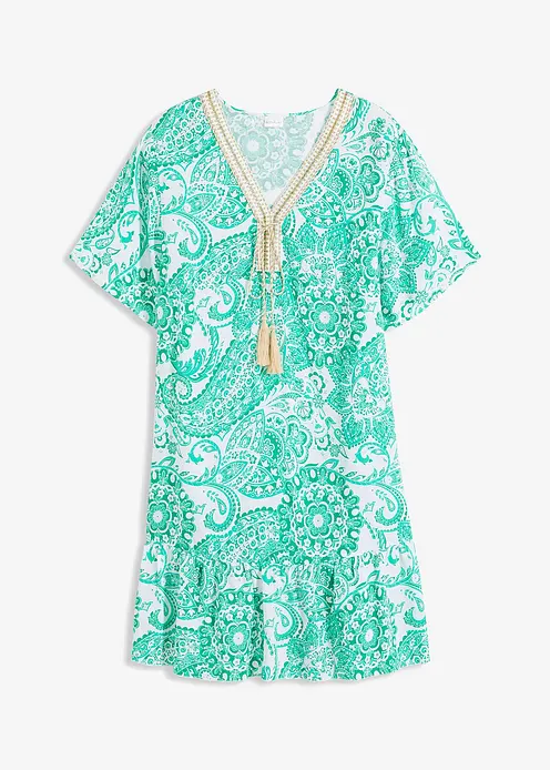 feminines Kleid mit dekorativer Applikation vorne am Ausschnitt