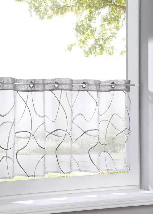 Tolle Fenstergestaltung für Deine Küche: die Scheibengardine ist aus transparenter Voile-Qualität und überzeugt durch seine auffällige Stickerei und der farbigen oberen Kante. Das moderne Gesamtbild wird durch die Ösen-Aufhängung betont.