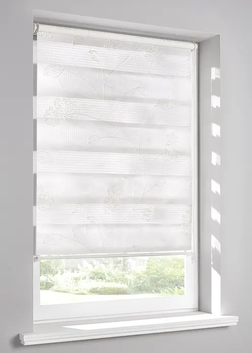 Tolle, florale Stickerei in Ranken-Optik! Mit dem trendig bestickten Doppelrollo kannst Du individuell die Lichtverhältnisse in Deinen Räumen regulieren. Der Stoff ist abwechselnd in transparenten und blickdichten Segmenten unterteilt und verläuft doppelt gegeneinander. Durch diese Technik lassen sich vielfältige Lichteinwirkungen über den rechts positionierten Kettenzug steuern: von Durchsicht zu leichter Transparenz bis hin zu Sicht- und Lichtschutz. Es ist stufenlos verstellbar. Das Doppelrollo wird schnell und mühelos mittels Kunststoff-Klemmträgern direkt am Fensterrahmen (für Fensterflügelstärke bis 1,6cm) montiert - ohne Bohren und Schrauben. Das angegebene Maß ist das Trägeraußenmaß, d.h. die Stoffbreite ist insgesamt 4cm schmaler. Das benötigte Zubehör wird mitgeliefert. Unser Doppelrollo "Stickerei" wird Ihnen viel Freude bereiten und kann hinzu noch funktionell eingesetzt werden.