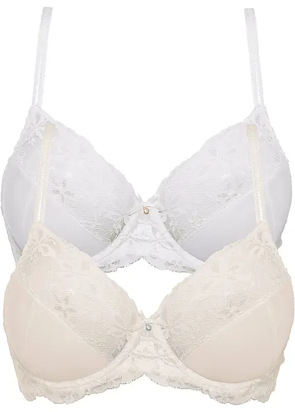 Dieser Doppelpack BHs von BODYFLIRT zeichnet sich durch ein romantisches Design aus. Die oberen Cups und der Steg sind mit feiner Spitze verziert. Eine kleine Schleifenapplikation setzt einen schönen Akzent an der Brücke. Die unifarbenen BHs überzeugen mit Bügel-Cups. In großen Größen sind Verschluss sowie Träger breiter gestaltet.