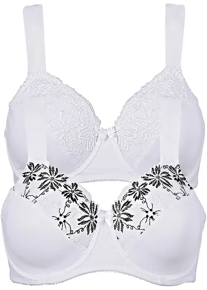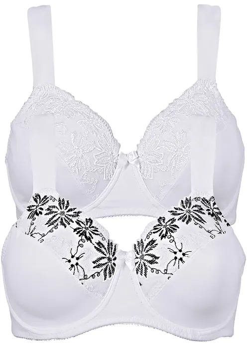 BH mit Bügel. Im praktischen 2er Pack. Je 1x weiß mit attraktiver Stickerei in schwarz/weiß und 1x mit einfarbiger Stickerei am oberen Cup. Die weich gepolsterten Träger des BHs entlasten die Schultern und bieten einen angenehmen Tragekomfort.