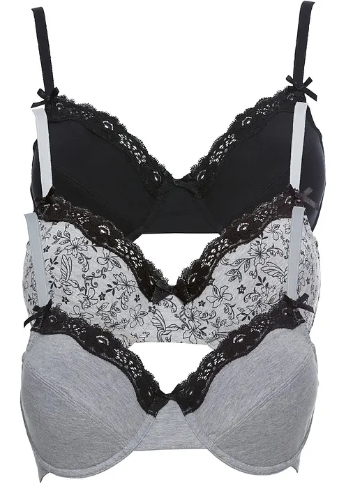 Drei attraktive Bügel-BHs der Marke bpc bieten durch eine ausgewogene Mischung von Baumwolle und Elasthan einen angenehmen Tragekomfort. Gleichzeitig sorgt der eingearbeitete Bügel für optimalen Halt. Auch ohne Schale wird die Brust optimal in ihre natürlich Form gebracht.In dem Pack sind zwei verschiedene, einfarbige BHs enthalten. Dazu ist ein BH mit einem bezaubernden floralen Muster verziert. Alle BHs sind an der oberen Cupkante mit einer schönen, elastischen Spitze geschmückt