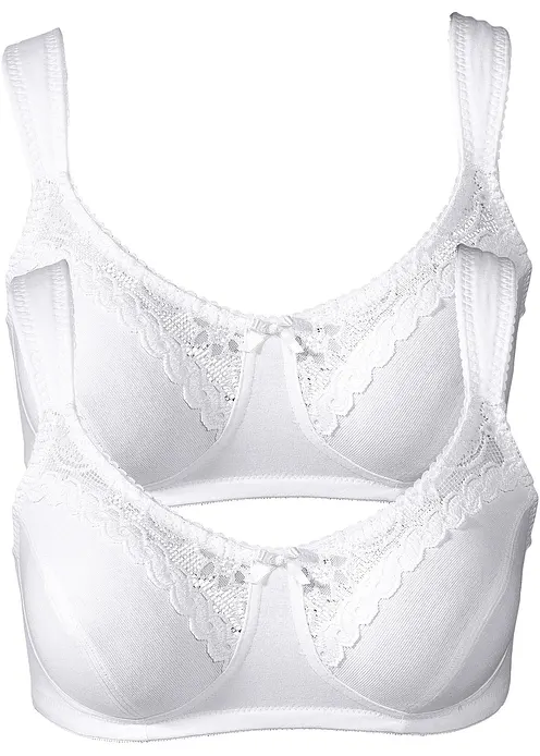Der Tragekomfort ist bei diesem BH ohne Bügel besonders hoch. Die verstellbaren Träger sind schön breit geschnitten und leicht gepolstert, damit sie nicht unangenehm einschneiden. Das macht den BH aus Bio-Baumwolle zum perfekten Begleiter im Alltag.An der oberen Hälfte der Cups ist edle Spitze verarbeitet, die dem BH im Zweierpack von bpc einen Hauch Raffinesse verleiht.