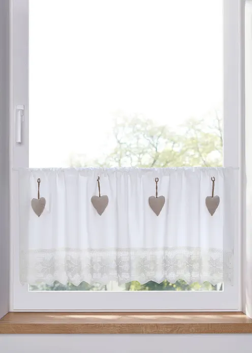Romantische Küchengardine mit hochwertiger Häkelkante und Herz-Applikationen