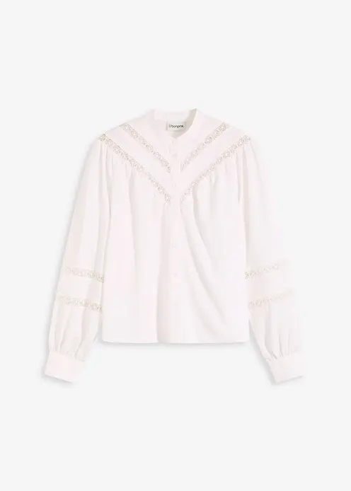 Bluse mit Leinenanteil und Crochet-Einsätzen in weiß von vorne - bonprix