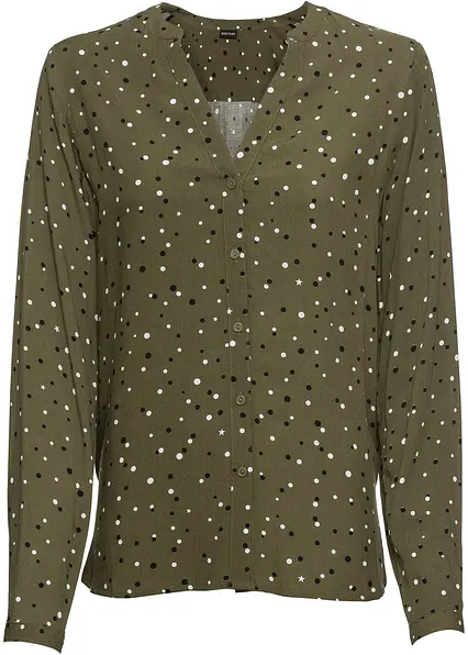 Attraktive Pünktchenbluse mit Knopfleiste und reizendem V-Ausschnitt.
