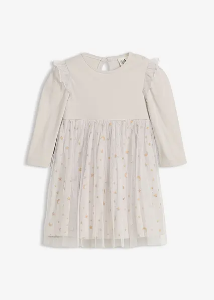 Praktisches Bodykleid mit Tüllrock und glitzernden Sternen. Der integrierte Body ist mit Druckknöpfen im Schritt ausgestattet und erleichtert so das An- und Ausziehen sowie das Wickeln. Der leichte Tüllrock mit Rüschen verleiht dem Kleid einen festlichen Charakter – ideal für besondere Anlässe.