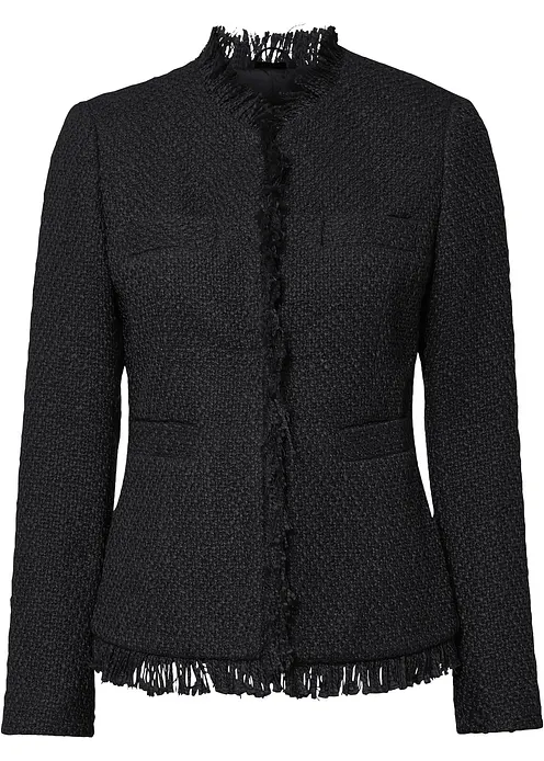 Modische Bouclé-Jacke mit dekorativen Fransen verziert.