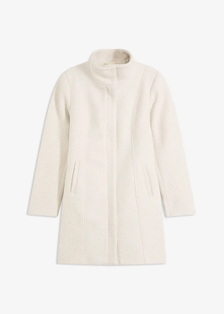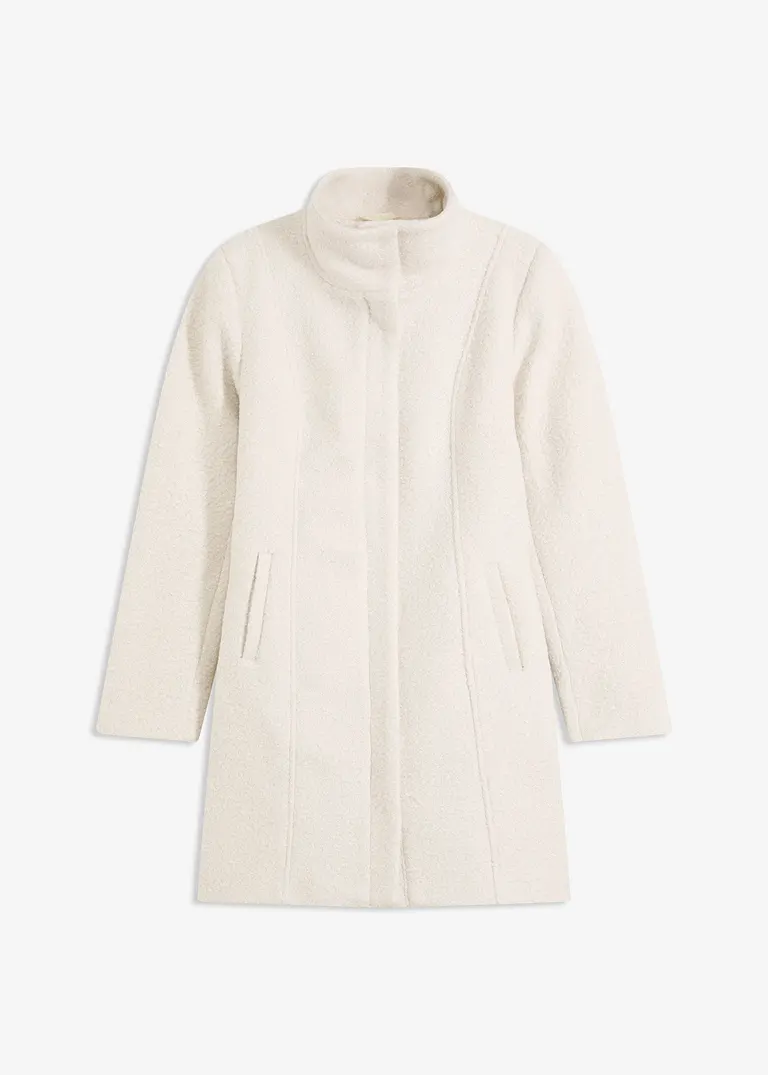 Bouclé Kurzmantel mit versteckter Knopfleiste, Stehkragen und zwei Eingrifftaschen. Länge in Gr. 38 ca. 86 cm.