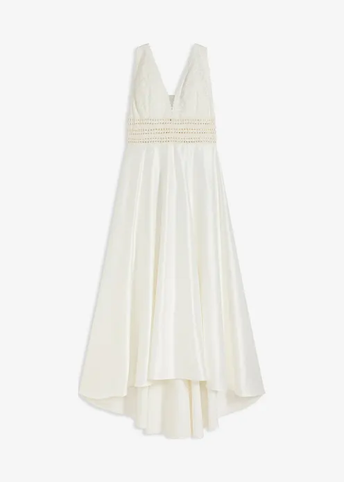 Modern und feminin: Langes Brautkleid aus glänzendem Satin mit Spitze im Oberteil und Häkel-Einsatz in der Taille