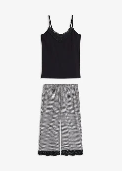 Gemütlicher Capri Pyjama mit femininer Spitze und schönem Druck
