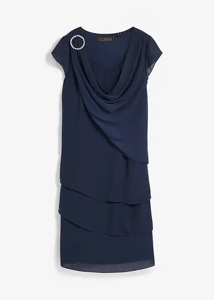 Elegantes und kaschierendes Kleid mit Wasserfallausschnitt mit Drapierung und dekorativem Accessoire
