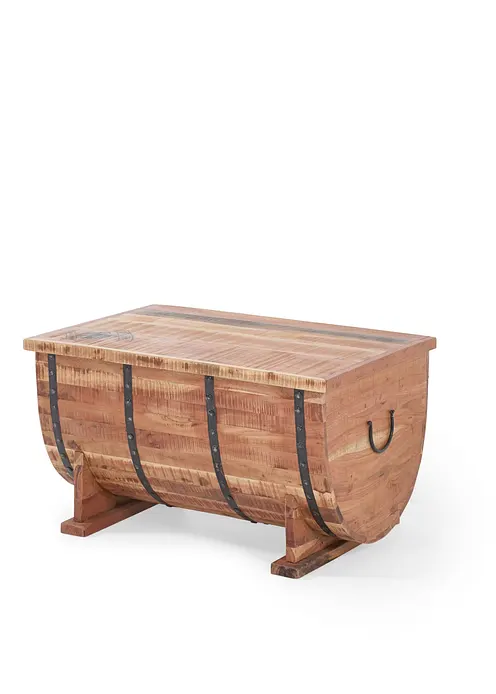 Origineller Couchtisch aus massivem Akazienholz und Metallbeschlägen. Perfekt zum Verstauen von Wohndecken oder Zeitschriften