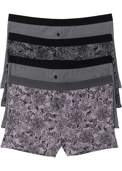 Diese Damen Boxer von bpc selection sind im vorteilhaften Viererpack erhältlich und bequeme Wäschemodelle für jeden Tag. Die Boxer liegen weich am Körper an und sitzen durch das elastische Bündchen sicher und angenehm. Der Zwickel besteht aus Baumwolle. Das dehnbare Material sorgt für viel Bewegungsfreiheit und die flachen Nähte sowie die soften Abschlüsse bieten weiteren Tragekomfort.Schöne optische Details sind der angedeutete Eingriff und die Zierknöpfe auf der Vorderhose.