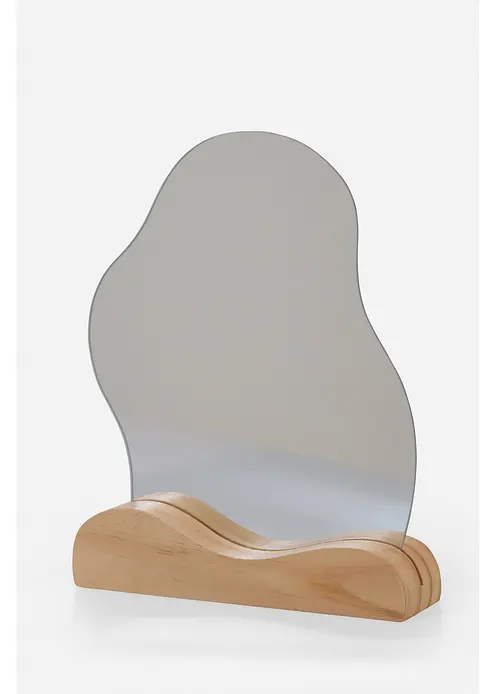 Dieser außergewöhnliche Spiegel vereint modernes Design mit funktionaler Ästhetik. Die organische Form und die sanften Linien verleihen dem Spiegel eine harmonische Präsenz, die in jedem Raum für eine besondere Atmosphäre sorgt. Der stabile Holzsockel sorgt nicht nur für Standfestigkeit, sondern ergänzt das Gesamtbild mit einem natürlichen Akzent. Ob im Flur, Schlafzimmer oder Wohnzimmer, dieser Spiegel ist nicht nur ein praktisches Accessoire, sondern auch ein stilvolles Dekorationselement, das den Raum optisch vergrößert und Licht reflektiert. Ein zeitloses Stück, das sowohl Funktionalität als auch kreatives Design in einem vereint.