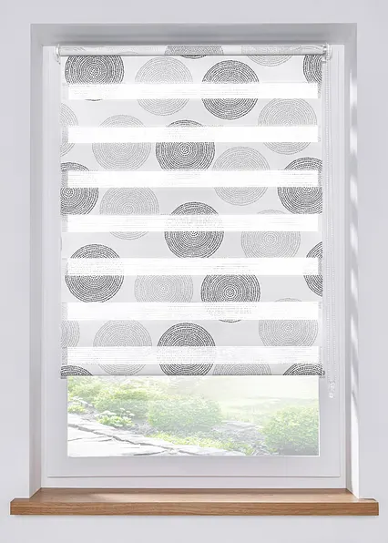 Das Doppelrollo wirkt durch sein bedrucktes Kreis-Motiv sehr modern und bietet durch die zwei parallel verlaufenden Stoffbahnen verschiedene Transparenzen: Von Durchsicht, leichter Transparenz bis hin zu Sicht- und Lichtschutz. Die Musterung ist von beiden Seiten sichtbar. Das Doppelrollo wird ganz einfach und ohne Bohren oder Schrauben mit Hilfe von Kunststoff-Klemmträgern auf dem Fensterrahmen (bis 1,6cm möglich) montiert.