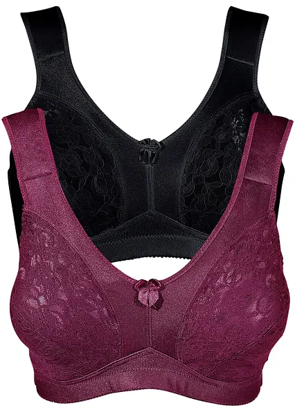 BH ohne Bügel im attraktivem 2er-Pack. Die gepolsterten Träger entlasten die Schultern und geben einen sicheren Halt. Die Cups sind mit hochweriger Spitze geschmückt.