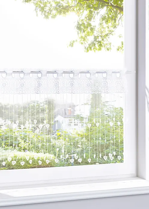 Hübsche transparente Scheibengardine mit tollen bestickten Fäden mit Herzen und schöner Häkelkante. Passend für Stangen mit bis zu 3cm Durchmesser.