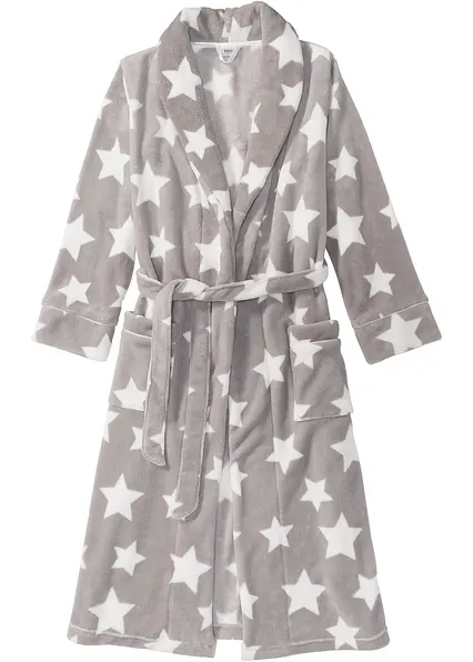 Der Bademantel ist aus flauschiger Fleece-Qualität gefertigt und sorgt für ein kuscheliges Tragegefühl. Das schöne Modell zeigt sich im klassischen Schnitt mit einem Bindeband zum Fixieren und mit zwei aufgesetzten Taschen vorne. Das Sternenmuster setzt einen modischen Akzent. Als komfortabler Begleiter beim Saunagang macht der Bademantel eine gute Figur.