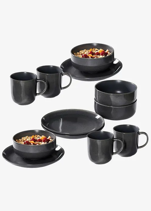 Das Frühstücksservice punktet mit einer minimalistischen, zweckbetonten Coupeform sowie einer raffinierten Kombination aus zwei verschiedenen Texturen: Innen- und Unterseiten der graphitgrauen Geschirrteile sind mit einem kreidig-soften Matt-Finish veredelt, Außen- und Oberseiten mit einer sogenannten Reaktivglasur, die während des Brennvorgangs individuelle Farbverläufe und Strukturen bildet, so dass - wie bei traditioneller Handwerkskunst - kein Geschirrteil exakt dem anderen gleicht. Mit seiner markanten, rustikalen Ästhetik passt das Geschirr nicht nur hervorragend zum toughen Industrial-Wohnstil, sondern kann auch in hellen, sanften Scandi-Interieurs ganz wunderbar einen starken Akzent setzen. Bestehend aus: 4 Kaffeebecher (400 ml), 4 Frühstückstellern (20,5 cm), 4 Schalen (14,5 cm)