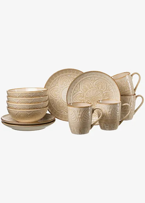 Mit seiner prachtvollen Relief-Ornamentik bringt das Frühstücksservice orientalisches Flair auf den Tisch. Anders als die oft farbenfrohen traditionellen Muster aus dem Morgenland präsentiert sich das Geschirr gleichwohl in schlichten Sandtönen mit einem charmant verwitterten Look. Diese besondere Optik entsteht auf Basis einer Reaktivglasur, die während des Brennvorgangs individuelle Farbverläufe und Strukturen bildet, so dass - wie bei traditioneller Handwerkskunst - kein Geschirrteil dem anderen gleicht. Bestehend aus: 4 Kaffeebechern (400 ml), 4 Frühstückstellern (20 cm), 4 Schalen (15,5 cm)