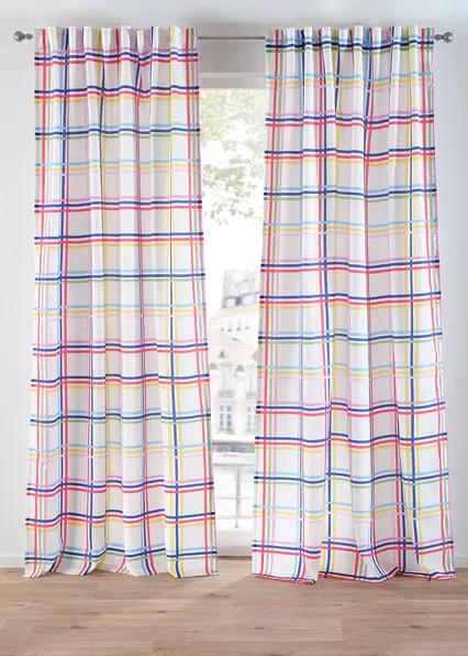 Farbenfrohe halbtransparente Gardine aus 100% recyceltem Polyester mit modernem bedrucktem Karomuster.