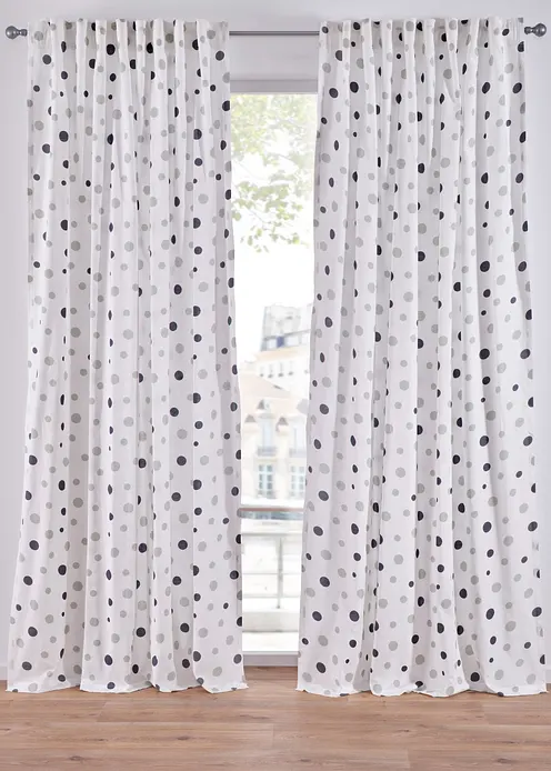 Diese Gardine ist aus nachhaltigem Polyester gefertigt und hat einen verspielten Punktedruck in zeitlosen Farben.