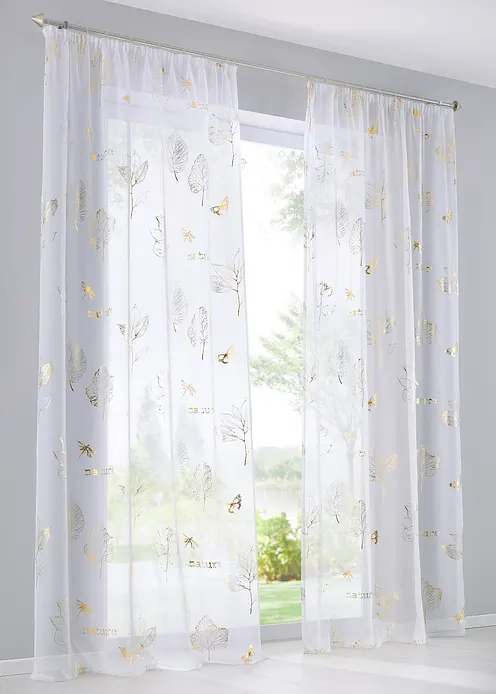 Unsere Gardine ist genau das richtige, wenn Du es edel und zeitlos zugleich magst. Das filigrane Blätter-Design ist aufgedruckt und gibt der Gardine das besondere Flair. Durch die Transparenz lässt diese Gardine schöne Lichtspiele in Deine Wohnräumen zu.