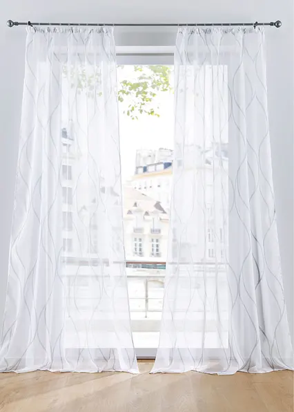 Hauchzartes Wohnaccessoire in moderner Ausführung! Die transparente Gardine ist in weiß mit einem modernem Druck in grau erhältlich und somit zu vielen Wohn-Stilen kombinierbar. Aus feinem Polyestermaterial gefertigt, präsentiert sich die lichtdurchlässige Gardine leicht fließend und pflegeleicht. Die Gardine besticht durch ihr innovatives Design und Ihre Leichtigkeit.