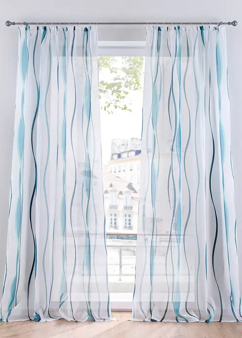 Lichtdurchlässige creme-/weißgrundige Gardine mit farbigen Akzenten, in attraktiven Farbvarianten, aus luftig-leichter Voile-Qualiät. Prima zum Kombinieren! Die Gardine ist ein Allrounder, da sie zu vielen Einrichtungen passt und ein zeitloses Design hat.