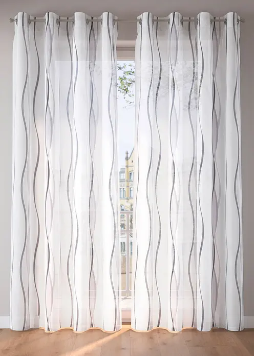 Lichtdurchlässige creme-/weißgrundige Gardine mit farbigen Akzenten, in attraktiven Farbvarianten, aus luftig-leichter Voile-Qualiät. Prima zum Kombinieren! Die Gardine ist ein Allrounder, da sie zu vielen Einrichtungen passt und ein zeitloses Design hat.