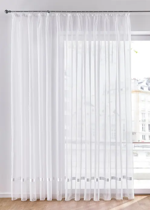 Stilvolle Fensterdekoration: der transparente weiße Store hat als besonderen Blickfang im unteren Abschluss ein Satinband aufgenäht. Die Gardine ist für viele Fenstergrößen geeignet, speziell für Blumenfenster und Terrassentüren. Das Beschwerungsband sorgt für einen tollen Fall des Stores. Wir empfehlen die 3-fache Fensterbreite zu bestellen, um die Gardine durch Kräuseln optimal zu dekorieren.