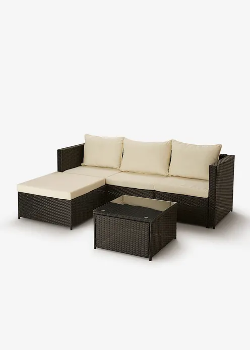 Bezug: 100% Polyester, Gestell: 100% Stahl, Polster: 100% Polyester, Geflecht: 100% Polyethylen, Tischplatte: 100% Sicherheitsglas