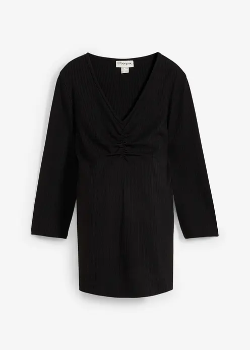 Umstandsshirt mit dekorativer Raffung am V-Ausschnitt aus weichem Viskose-Jersey mit Stretch für einen angenehmen Tragekomfort. Der elastische Rippstoff passt sich wunderbar dem wachsenden Babybauch an und bietet gleichzeitig ausreichend Bewegungsfreiheit. Mit 3/4 Ärmeln und hüftumspielender Länge.