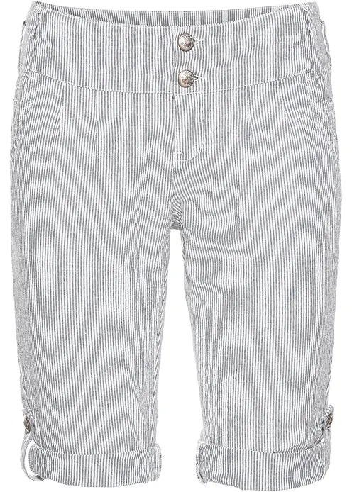Diese stylishen Shorts mit feinen Streifen verschaffen langen Beinen einen großen Auftritt: Die schmal geschnittene Hose in 3/4-Länge lässt sich bis auf Bermuda-Länge krempeln und mit Knopf und Riegel fixieren. Der breite Taillenbund mit Gürtelschlaufen schließt vorne mit zwei Knöpfen.Die gestreiften Shorts lassen sich zu Tops, Blusen und Shirts tragen.