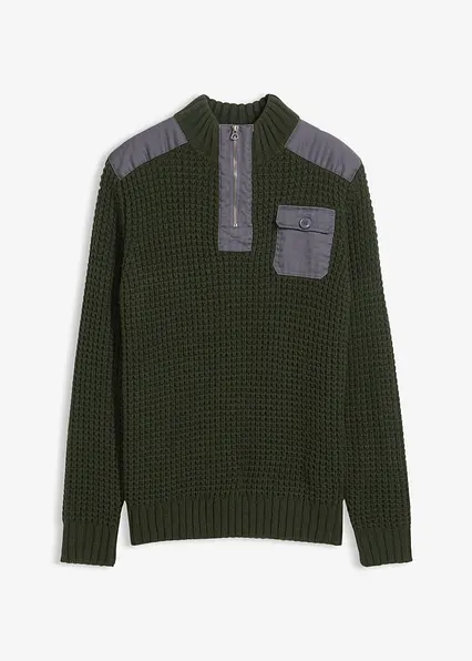 Dieser komfortable Herren Pullover aus der aktuellen Kollektion von John Baner ist ein echter Allrounder für die Freizeit. Der legere Pulli aus grobem Strick hat einen Stehkragen mit Zipper und lange Ärmel. Eine aufgesetzte Brusttasche sowie Stoff-Applikationen auf den Schultern unterstreichen den modischen Look des Pullovers.Er lässt sich vielseitig zu Jeans und Chinos kombinieren.