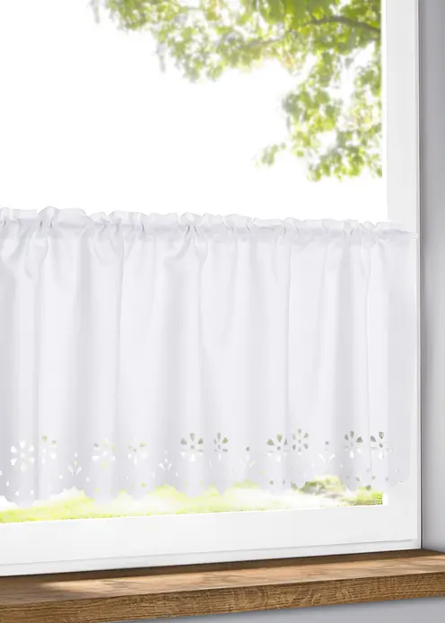 Die Scheibengardine überzeugt mit einem originellen Blumen-Motiv, das mittels Lasercut-Verfahren ausgeschnitten wurde. Durch den praktischen Tunnelzug kann die Küchengardine einfach und schnell mit einer Einhänge- oder Klemmstange an der Fensterscheibe angebracht werden.
