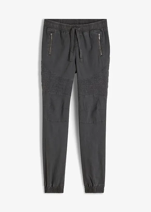 Diese Jogg-Style-Hose verbindet tolle Designs zu einem neuen Look. Die geriffelten Nähte auf Höhe der Oberschenkel erinnern an Bikerhosen. Ein breiter Rundumgummizug mit Bindeband am Bund und die elastischen Bündchen am Beinende sind Elemente von Sweathosen. Auch die schmale Silhouette liegt im Trend.Zwei seitliche Eingrifftaschen mit Reißverschluss runden die coole Jogg-Style-Hose ab. Das Modell überzeugt zu Sweatshirt und Sneakern ebenso wie mit Lederimitatshirt und Boots kombiniert.